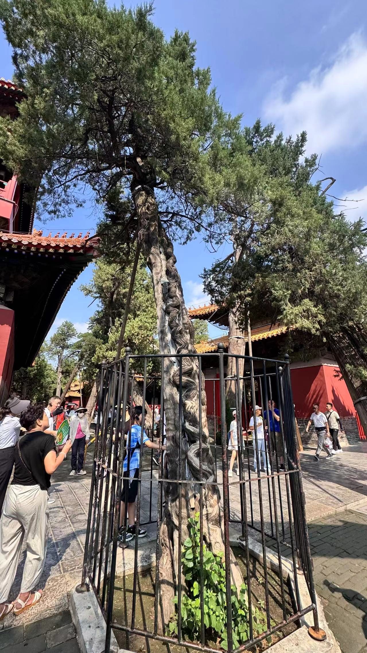 这颗龙柏,传说是乾隆皇帝走到这里,有点累,依靠了它,它身染龙气,于是背后长出了龙纹。